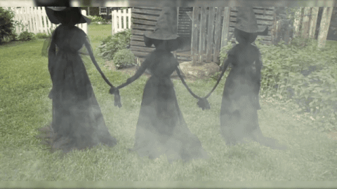 Spooky Sisterhood – These three witches are connected in a chilling tableau, holding hands with flowing black dresses and pointed hats for seamless cohesion.