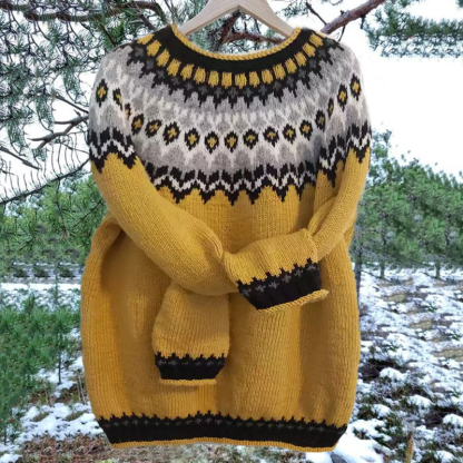 Unisex Vintage Icelandic Yellow Knit Jacquard Warmth Crew Neck Sweater