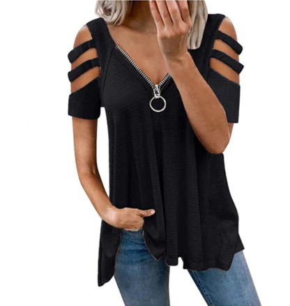 Cold Shoulder Cutout Zip Front Waffle Knit Top