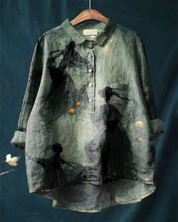 Halloween Witch Art Cotton and Linen Casual Shirt